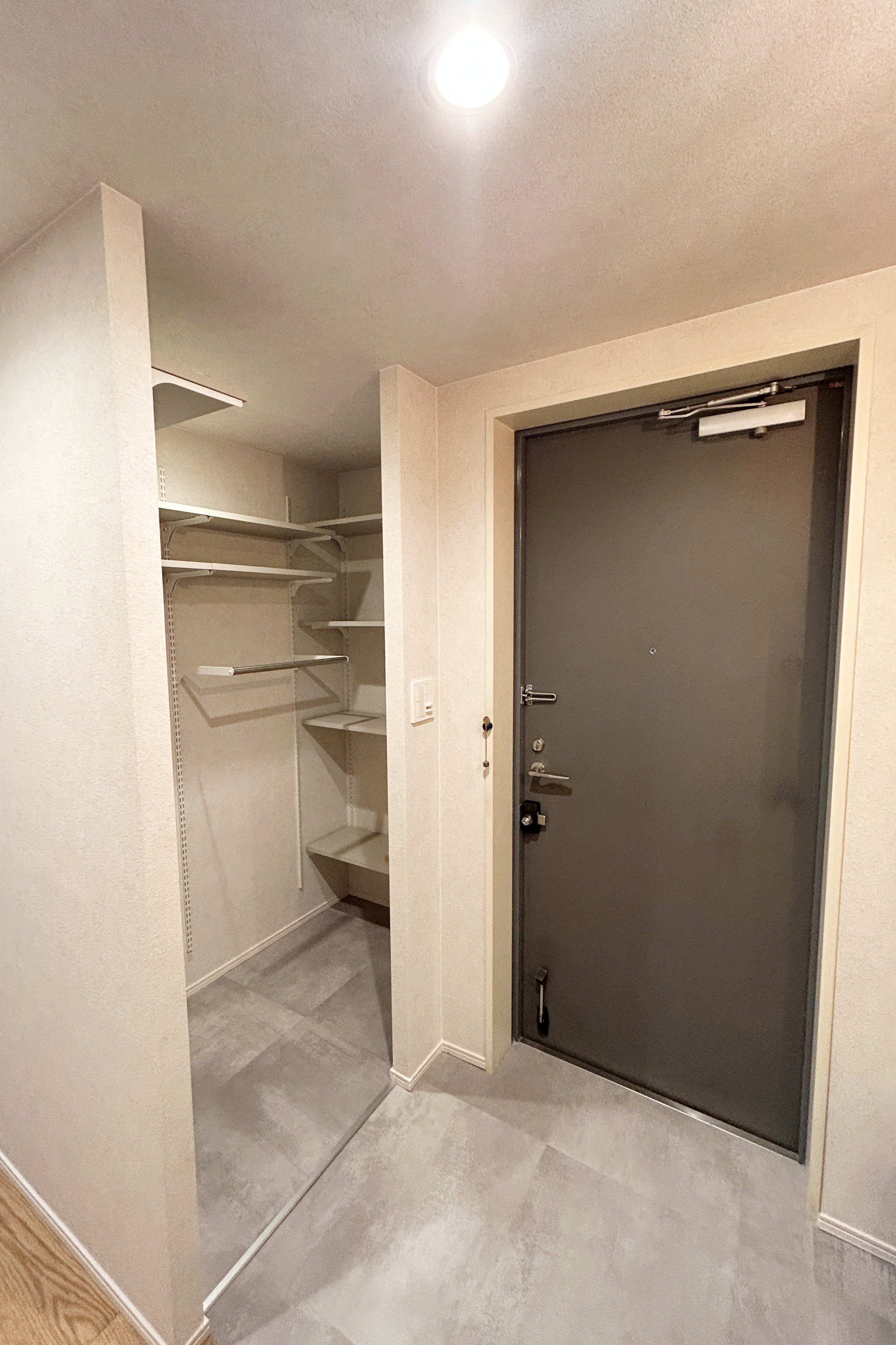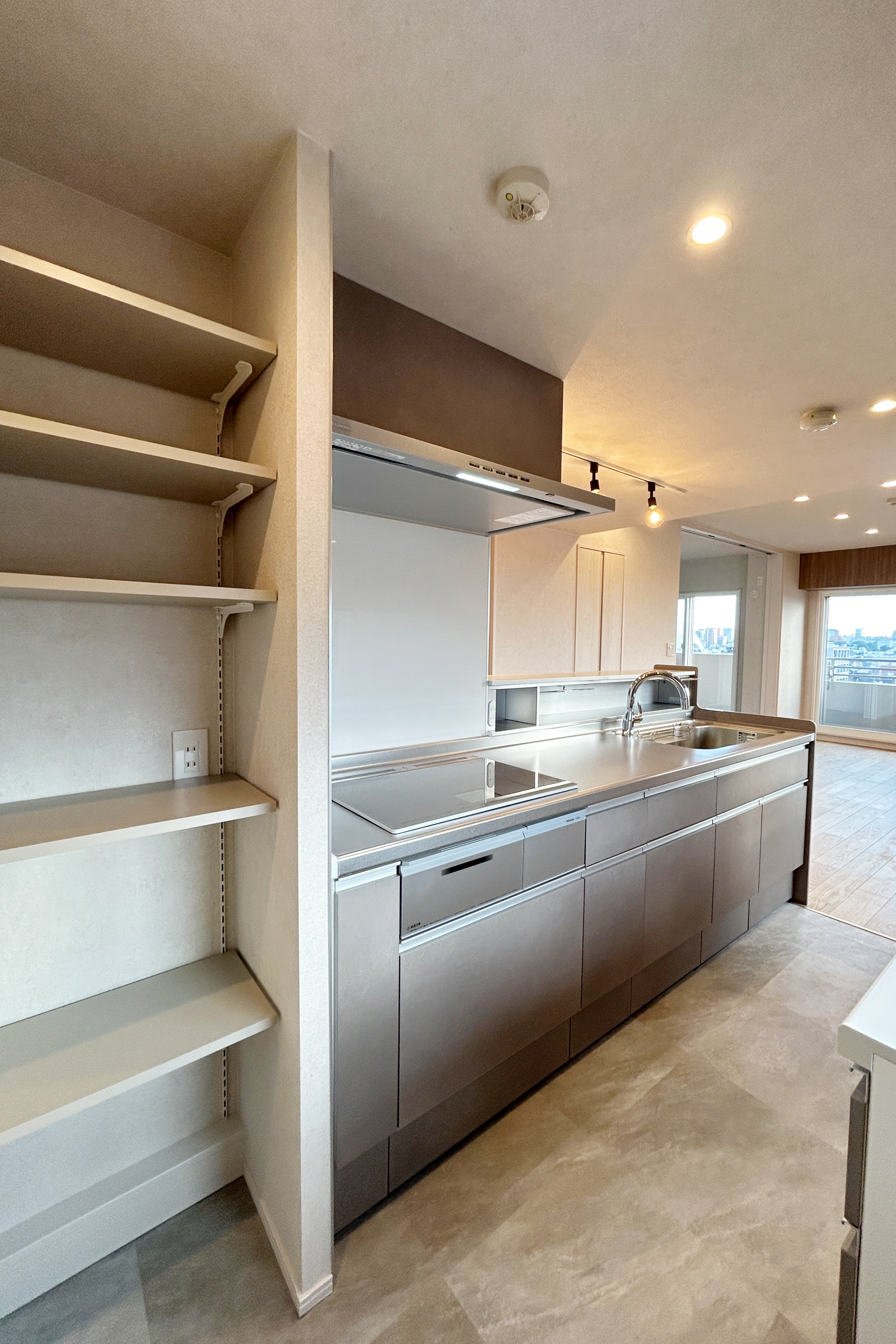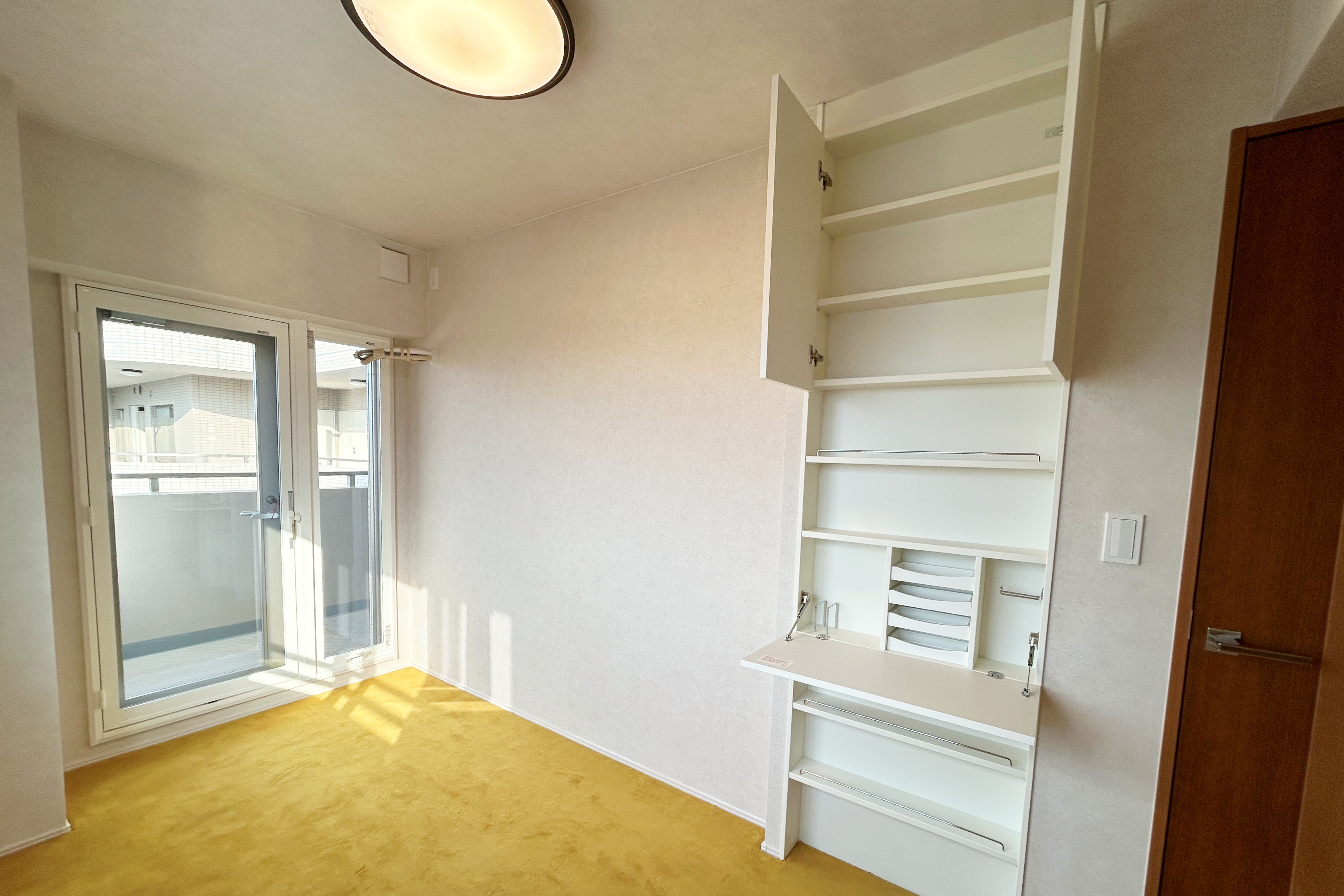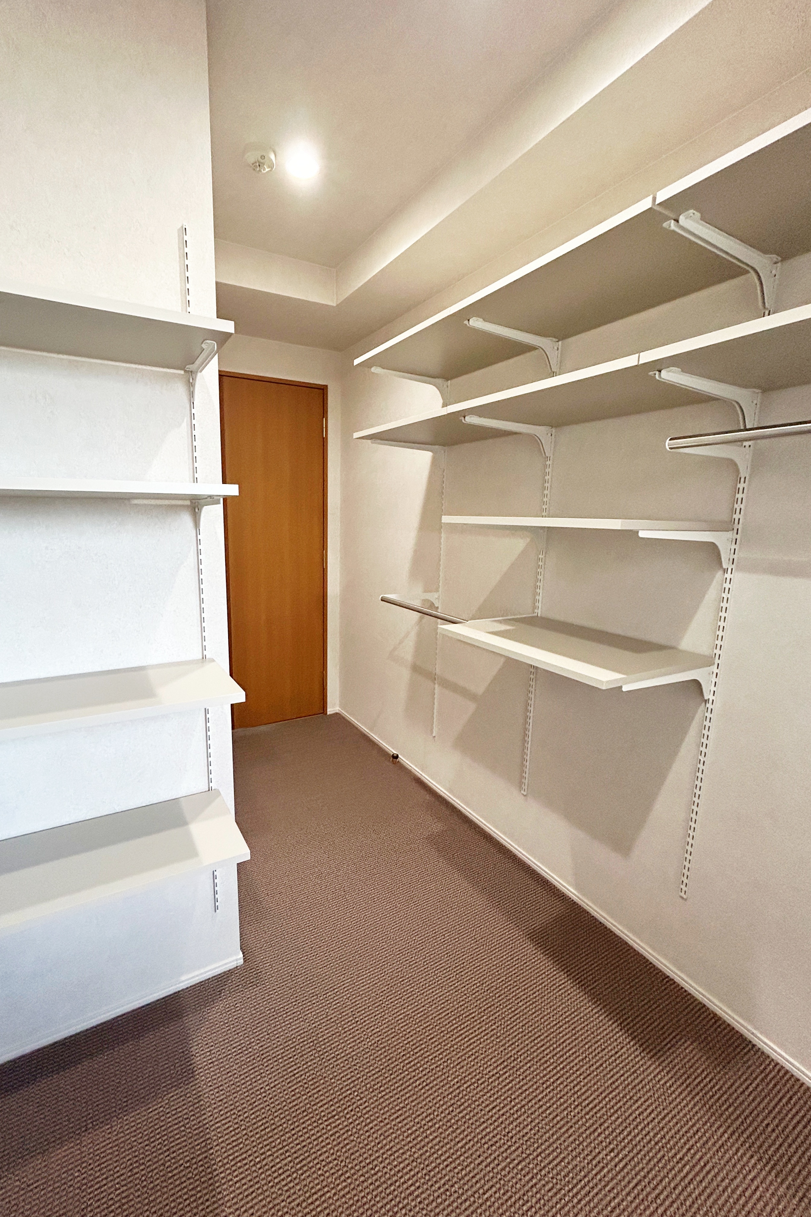 キッチン横には食品ストックに便利な可動棚を設け、寝室には新たに壁面収納を設置しています。